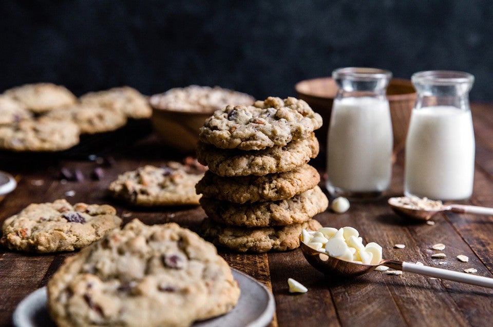 Here's the dough with the oats, white chocolate, and flour added; that white chocolate is going to add a certain “mmm-MMM!” to the finished cookies.