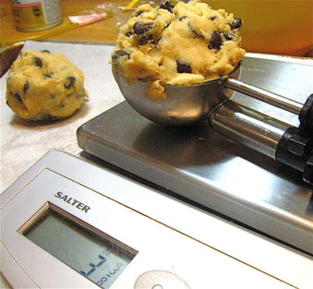 For big, 5” cookies, scoop 3 3/8- to 3 1/2-ounce balls of dough, a very slightly heaped 1/3 cup. Our muffin scoop works well here; this is what it'll look like.