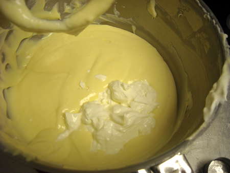 Everything nice and smooth? Ok, now you can add the vanilla and the eggs, one at a time. Too many eggs at once will make you a big slimy mess that won’t want to mix; you need the traction of the cream cheese mixture’s thickness to help you incorporate the egg.