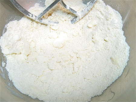 2. Add the shortening, working it in till it's thoroughly dispersed throughout the dry ingredients.