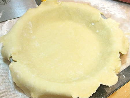 8. Transfer the crust to a 9" pie pan. Trim the edges (patching any bare spots, if necessary), and make a tall crimp.