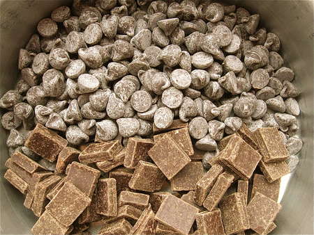 11. Stir in the flour, the cooled, melted butter; the espresso powder, and vanilla. Then add the chocolate chips/chunks and the diced pecans, stirring until all the ingredients are evenly incorporated.