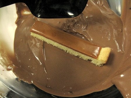 Cut the bars down the center lengthwise, then cut each half into "fingers". You can make them as thick as you like, but remember: if they're too thin, they'll break as you try to coat them in chocolate.