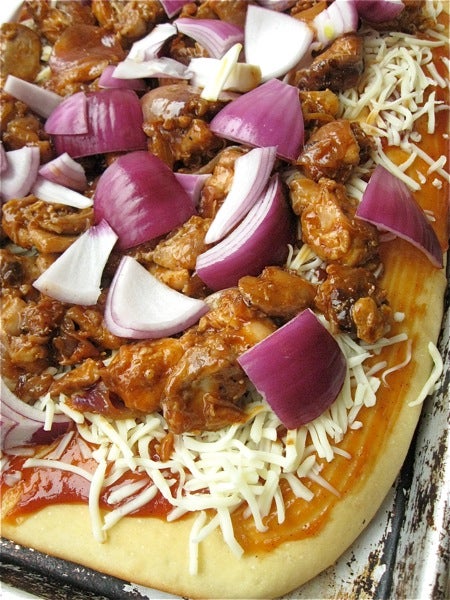Our iteration skips the cilantro and Gouda, but otherwise remains true to the original: chicken, barbecue sauce, mozzarella, and red onions.