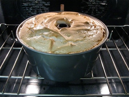 Spoon the batter into an ungreased 10" round angel food pan. Gently tap the pan on the counter to settle the batter and remove any large air bubbles.