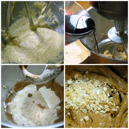 The batter comes together just like a cake or cupcake batter. First you cream the butter and sugar, then add the egg. Add half of the flour/spice mixture, then pour in the molasses. Add the remaining dry ingredients and the buttermilk. At the end, stir in the mini diced ginger bits by hand. Check the recipe here for details.