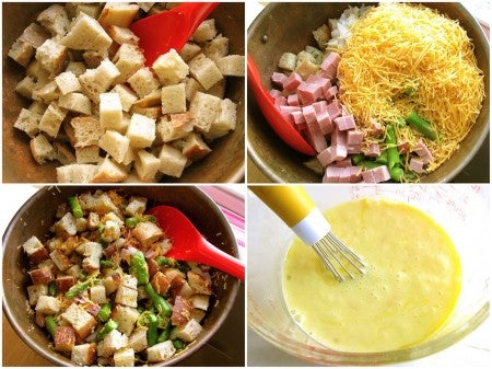 Put the bread cubes in a large bowl. Toss with 1/2 pound (227g) ham, diced; the asparagus; and 1 1/2 cups (170g) shredded cheddar cheese.