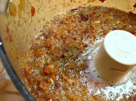 Pour the jam into a food processor or blender, removing the bay leaves, and pulse to a relish consistency. You may find that there is still a bit too much liquid for your liking at this point. Easily fixed...