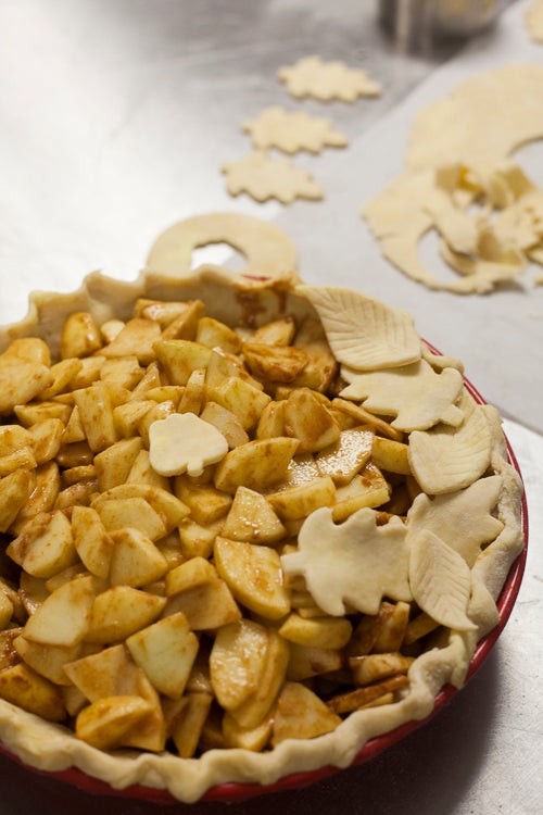 and place the shapes on top of the filling. Easy as… yes, pie to do, and looks just gorgeous. If you want to get all in it, you can emboss the leaves with a paring knife, la de da!