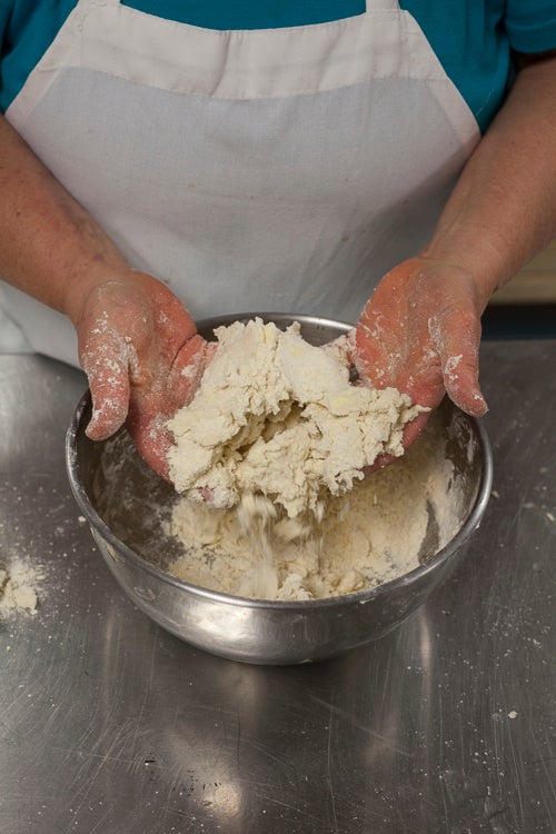 Repeat, spritzing as necessary, until the dough comes together, with some dry crumbs still shedding around the edges.