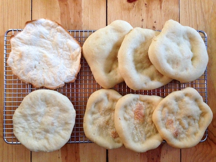 Divide the dough into six pieces initially, rather than 10. Flatten each piece into a round about 5 1/2" in diameter. Place the rounds on a lightly greased or parchment-lined baking sheet, cover the sheet, and let them rise for 1 to 2 hours, until they're quite puffy.