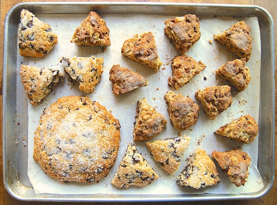 Look at those chocolate chips! You wouldn't get that tantalizing meltiness in scones that were individually shaped before baking.
