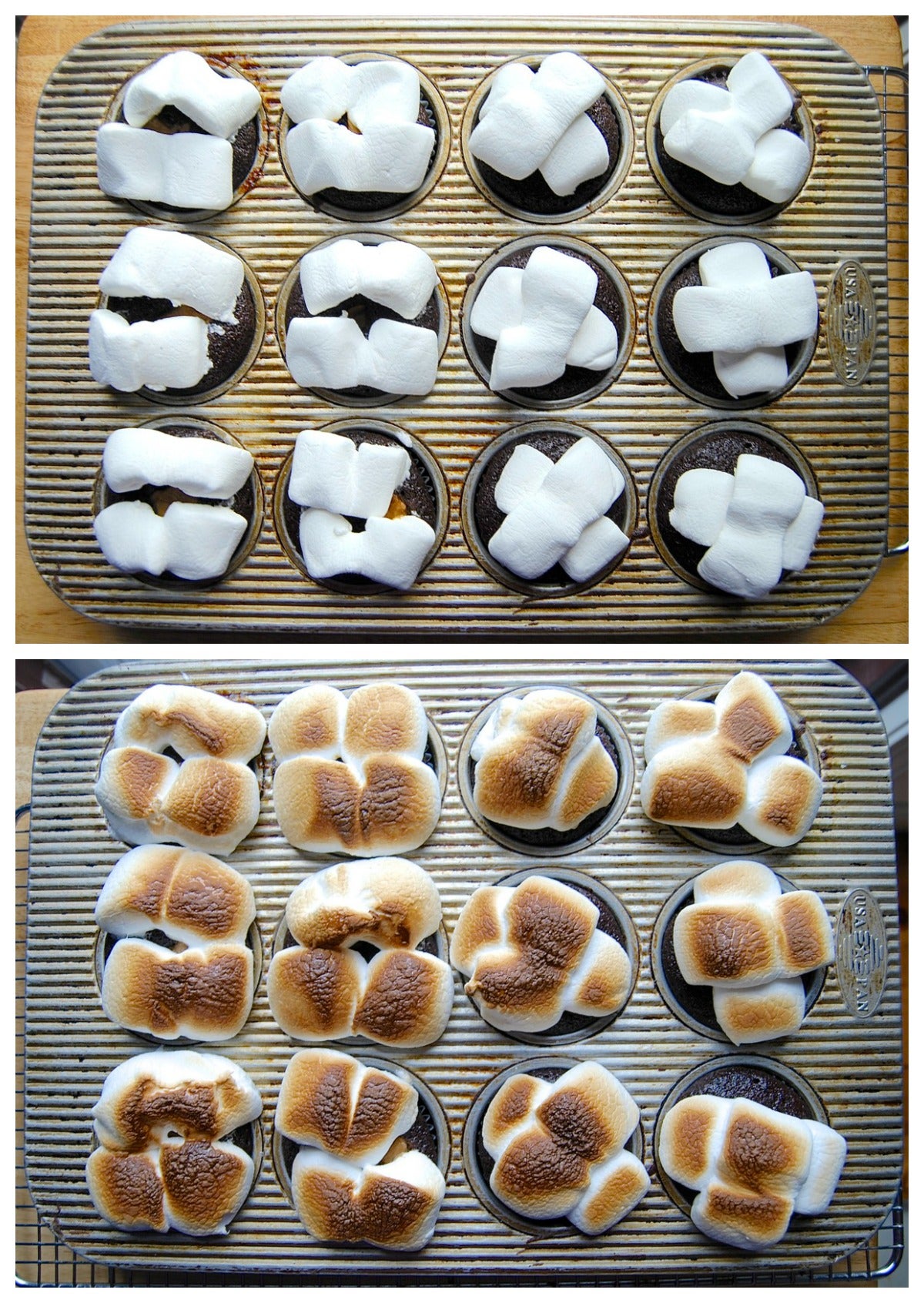 Place the pan back into the oven, and broil the cupcakes until the marshmallows are toasted; this could take less than a minute, so keep your eye on them.