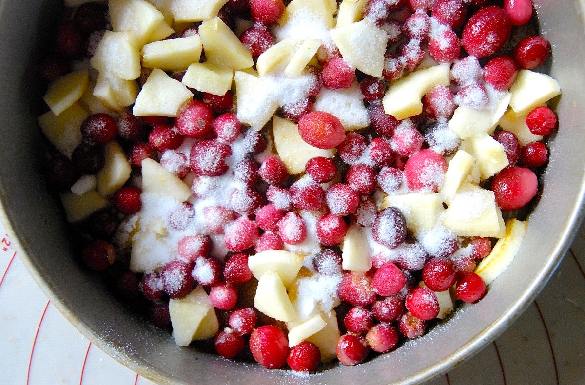 I run a medium-large Russet apple through my apple peeler/corer/slicer, and chop the resulting slices in thirds to yield about 1 cup (113g) of fruit. I combine the apples with 1 1/2 cups (170g) cranberries. The goal is 2 1/2 cups fruit, total; feel free to use your own balance of apple/cranberry.