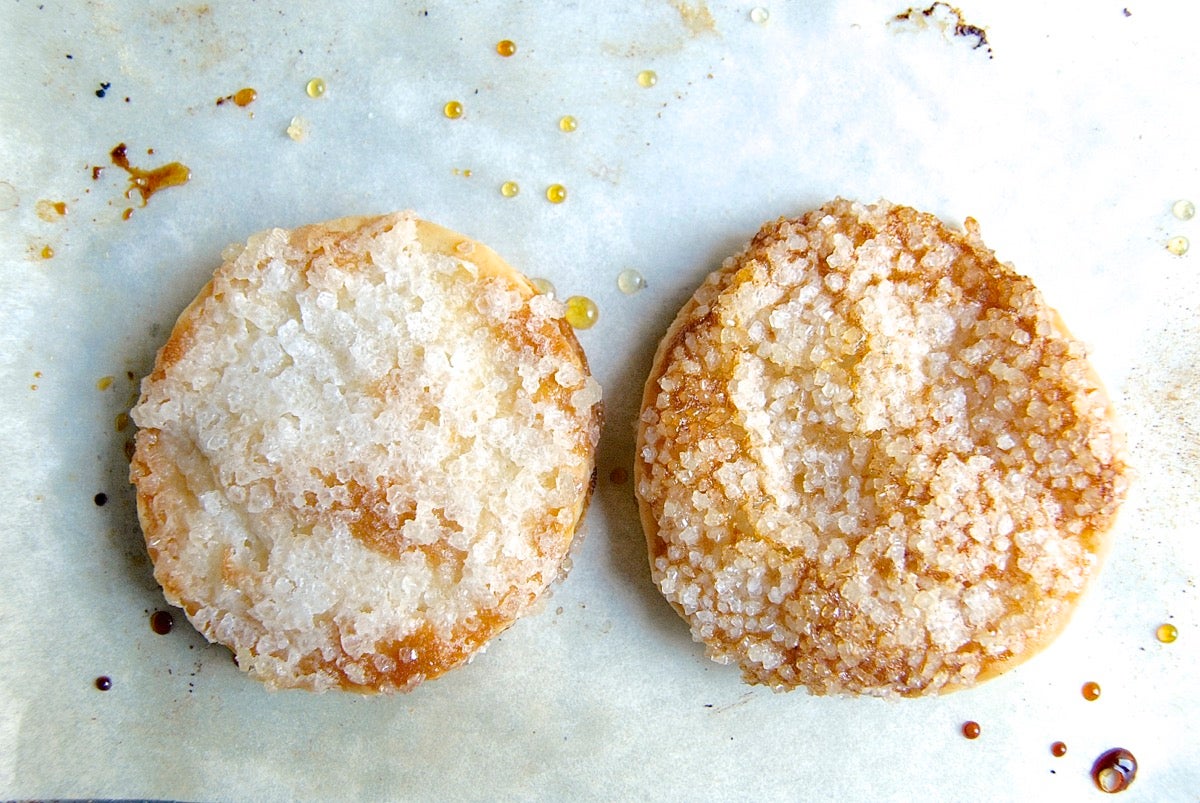 Note how regular granulated sugar (left) melts a bit to form shards of sweetness. The cinnamon-sugar (right) adds color and wonderful flavor, but I should have been more careful when sprinkling; the opaque patch signals too thick a coat.