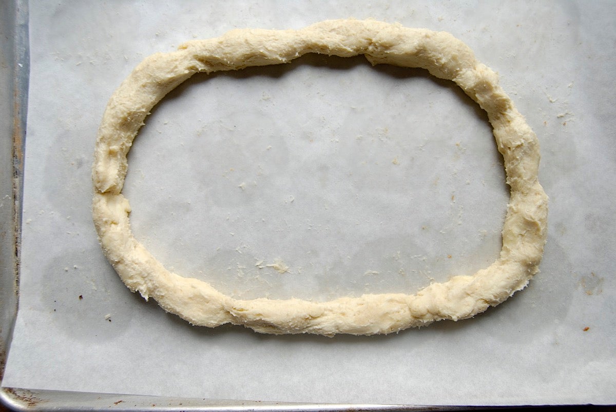 Once you've made the ring, flatten the dough so it's about 1 1/2" wide; basically, it'll look like a NASCAR track.