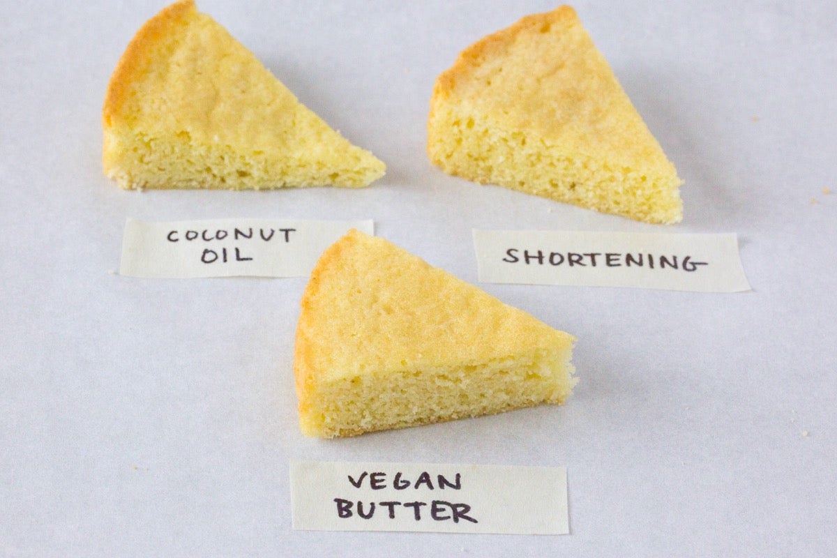 The flavor of the cake made with vegan butter was most similar to a dairy-based cake. We recommend using vegan butter as it provides the most consistent, delicious results.