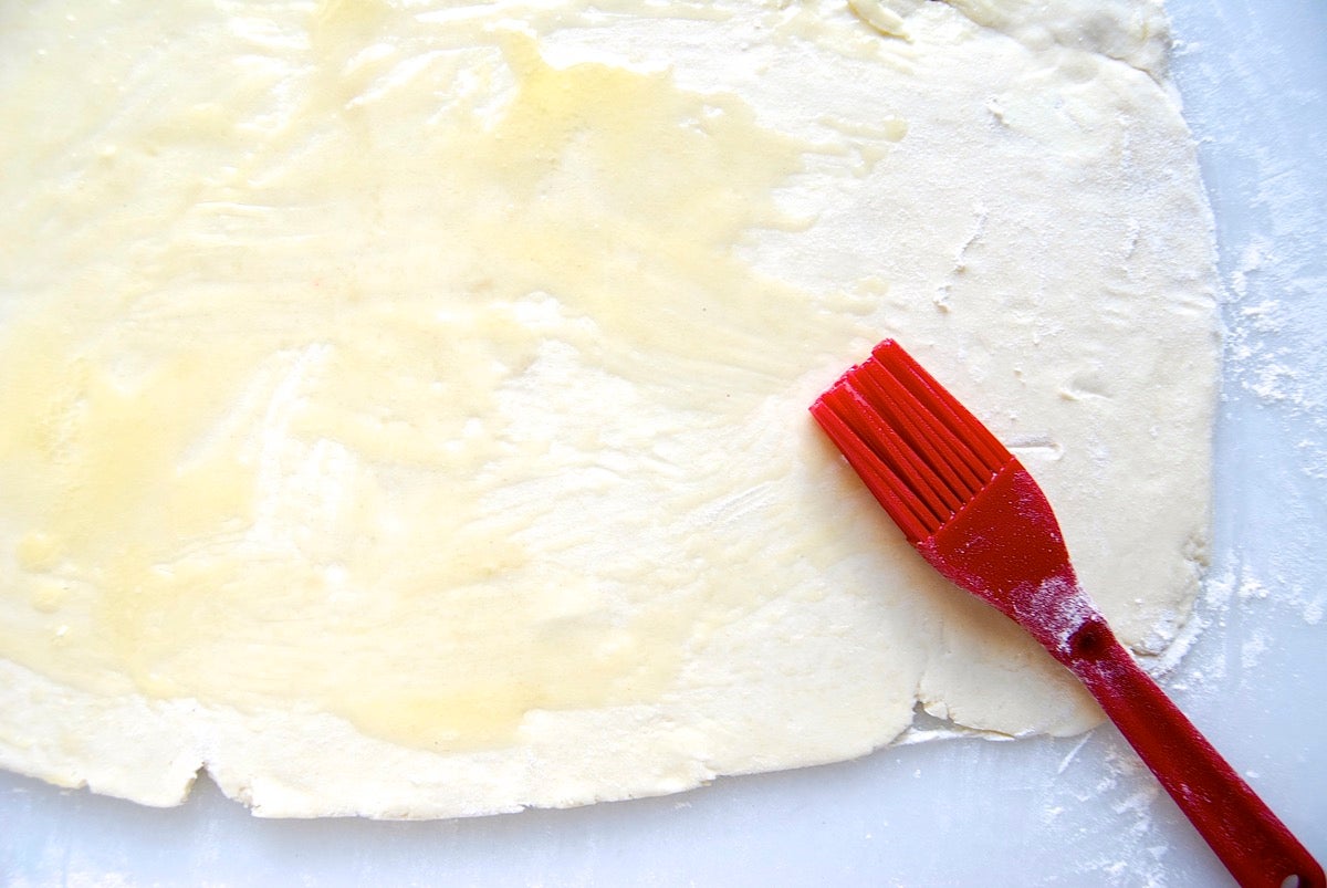 I'll make the spinach and feta rugelach first. Since feta is fairly low in fat, I brush the dough with some melted butter for extra richness.