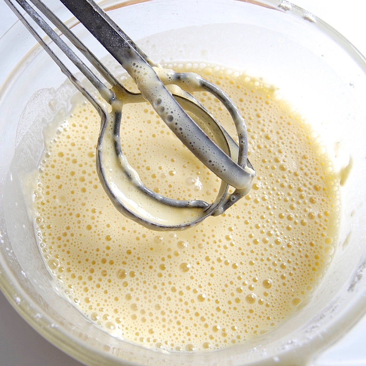 Beat together the eggs, milk, and salt until thoroughly combined, with no streaks of yolk showing. Use a wire whisk, an eggbeater, or your stand mixer using the whisk attachment.