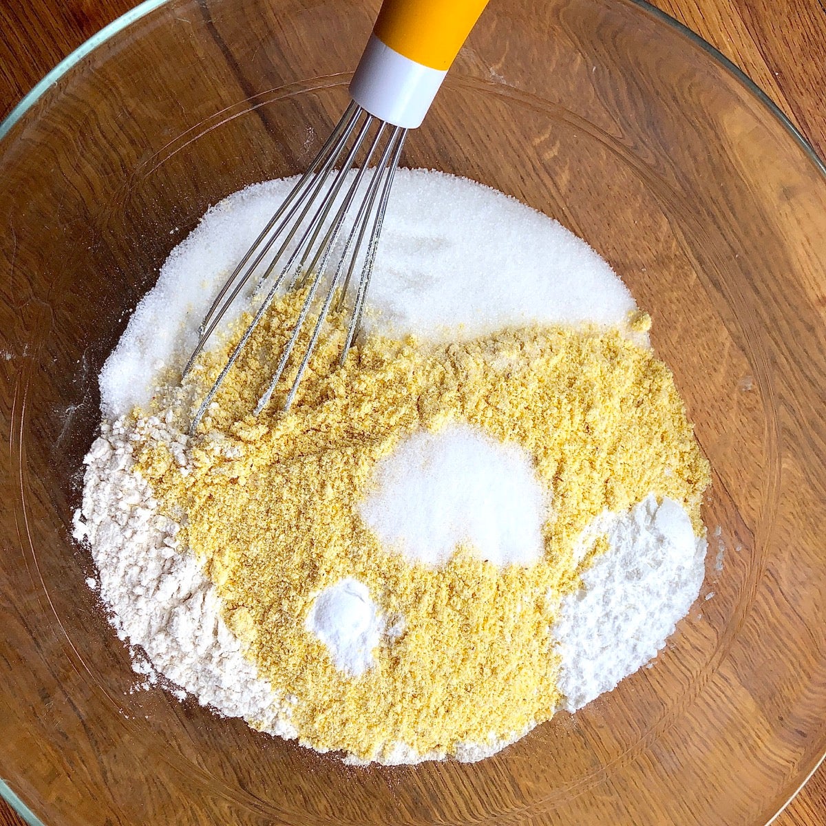Whisk everything together thoroughly. This means you shouldn't see either yellow streaks of cornmeal or white streaks of flour.