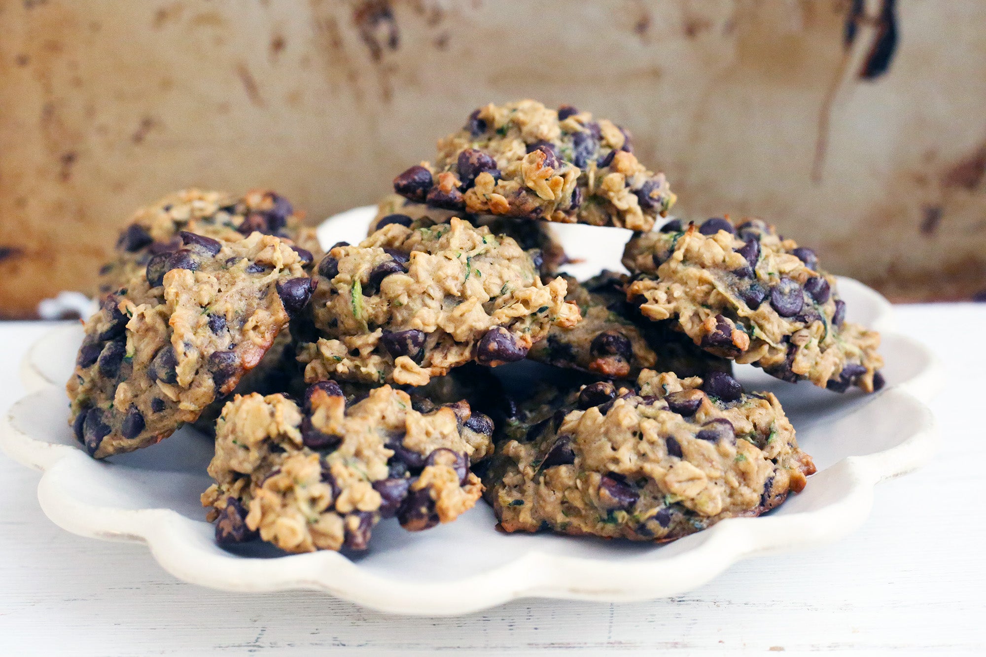 Last, a surprise twist to your zucchini adventure: Zucchini Oatmeal Chocolate Chip Cookies! Imagine a perfect oatmeal cookie, full of chocolate chips and warm spices. Now imagine one with a light and cakey texture, moist on the inside with golden edges of toasted oats. That’s what this zucchini recipe is all about. The zucchini gives volume to the batter, so they bake up more cake-like than chewy, but still pleasantly dense as a good cookie should be.