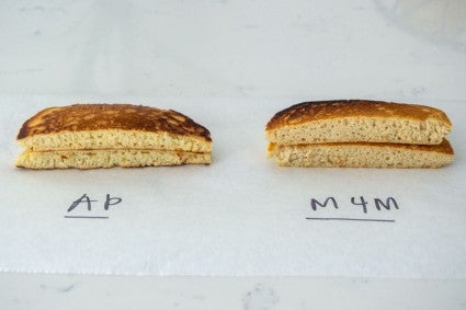 Going gluten-free has benefits for all pancakes, not just mixes — Simply Perfect Pancakes prepared with Measure for Measure instead of all-purpose flour are soft and delicate. Similar to waffles, the gluten-free starches crisp nicely from the high heat of the griddle, creating a golden brown exterior ready to soak up maple syrup. Meanwhile, the lack of gluten prevents the batter from getting overworked and the resulting pancakes from turning out rubbery.