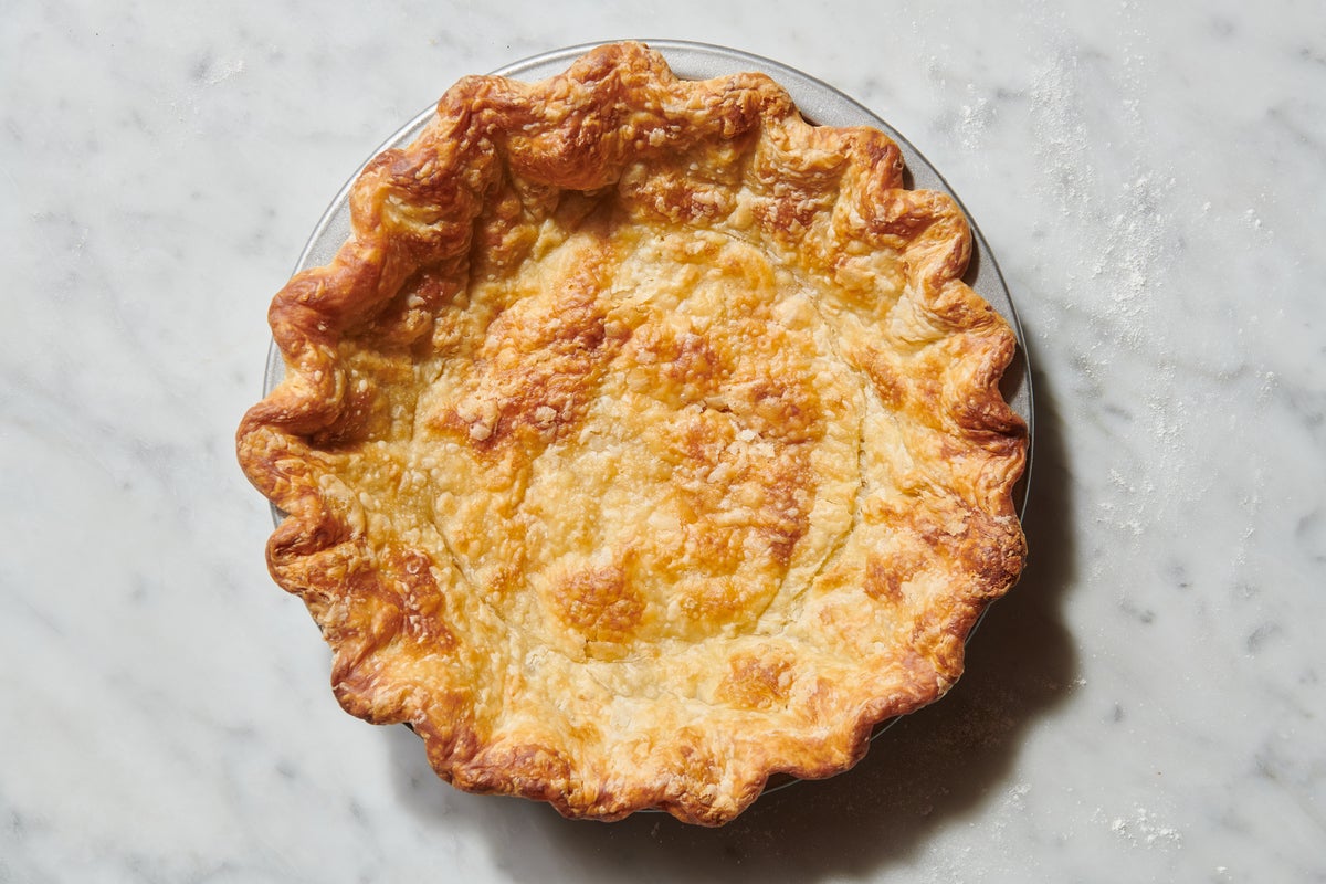 Pie crust’s tendency to shrink and slip as it bakes is mainly due to its fat: As the fat melts while baking, the crust can collapse. For this reason, a crust made with vegetable shortening, or a combination of shortening and butter, is less likely to slump than one made with just butter, since shortening has a higher melting point than butter.