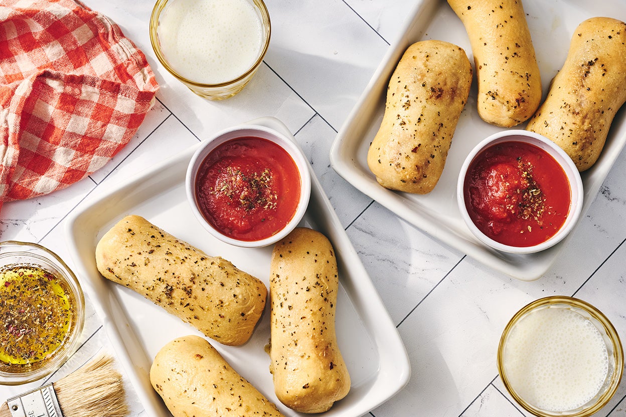 Chewy from semolina flour and tender from ‘00’ Pizza Flour, these cheesy breadsticks are delightful even before you realize each one is filled with stretchy mozzarella cheese. Our inspiration for this recipe comes from the beloved cafeteria food known as Bosco Sticks, which are brushed with butter, sprinkled with Parmesan, and served with marinara sauce for dipping. They’re best devoured fresh from the oven when the cheese is at its meltiest, but we don’t think eating them quickly will be a problem.