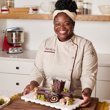 Lightly dust the Bûche de Noël with confectioners’ sugar, then use the melted chocolate or reserved ganache to attach the mushrooms, and decorate with the moss and pomegranate seeds as desired. (Placing some of the decoration around the base of the log and some on top creates a beautiful scene.)