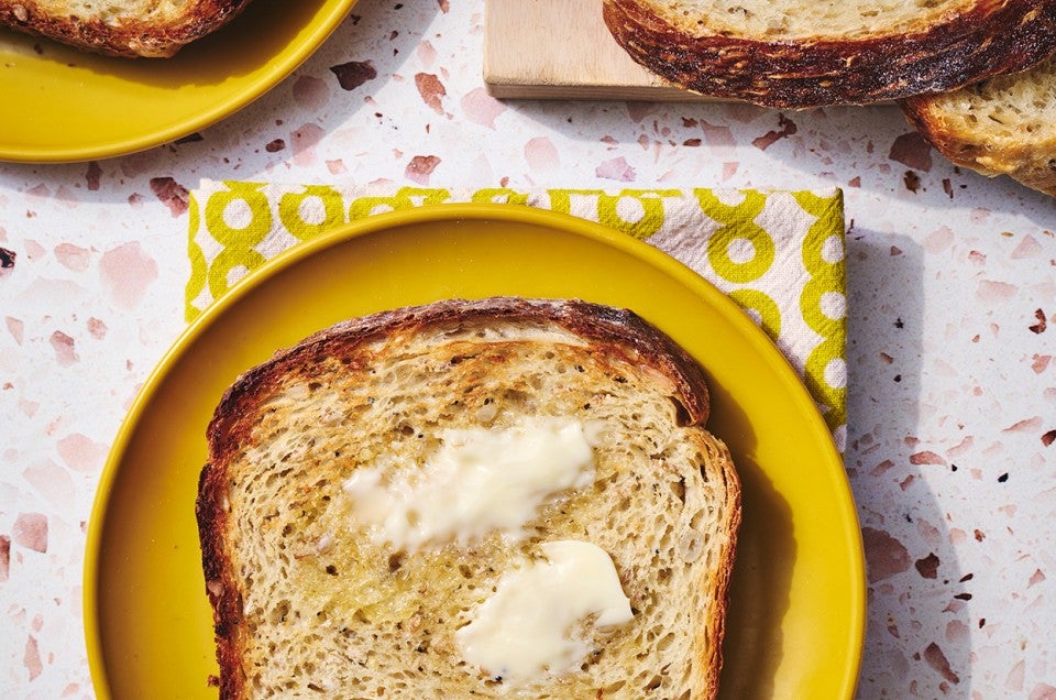 This unusual sandwich bread has the chewy texture of an artisan loaf, rather than the soft/tender texture of a typical loaf-pan bread. Happily, this makes it perfect for sandwiches: easy to slice (no crumbling), and sturdy enough to pack for lunch. And its tangy, rich taste is perfect with grilled veggies, ham and cheese, chicken salad, and all manner of favorite fillings.