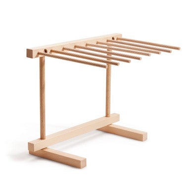 Roll the dough through a pasta machine once on the largest setting. Fold the dough in thirds like a letter (this helps it become a rectangular shape) before rolling it a second time on the largest setting. Adjust the pasta machine to the next increment and pass the dough through. Continue adjusting the setting and rolling the dough through the machine until you’ve used reached your desired thickness (we prefer rolling to setting #7 or #8). Once you've rolled out one section of dough, set it aside, uncovered on your prepared work surface or pasta drying rack, while you roll out the rest.