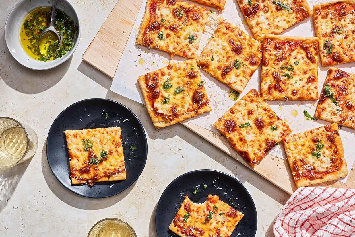 Cover the pan and allow the dough to rise at room temperature for 1 hour, until the dough is visibly puffy around the edges. Toward the end of the rising time, preheat the oven to 425°F with a rack positioned in the center. While the crust rises, prepare the garlic-basil oil.