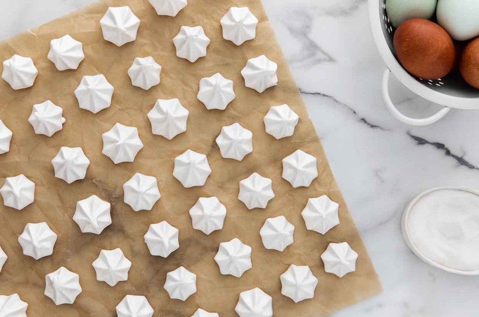 These simple meringues — crisp, airy puffs of sugar and egg white — are a pretty addition to any cookie tray or dessert buffet.