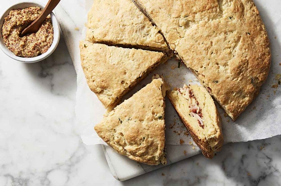 Mustard gives herb-laced, buttery dough a piquant flavor in these savory biscuits filled with ham and cheese. Baked together then sliced in wedges, they're like the best marriage of a biscuit and a grilled cheese sandwich.