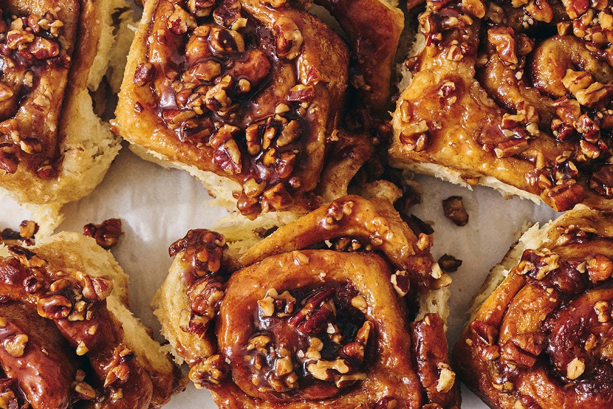 To bake the buns: Bake the sticky buns for 40 to 45 minutes, tenting them lightly with aluminum foil for the final 5 minutes if they appear to be browning too quickly. The finished buns will be golden brown.