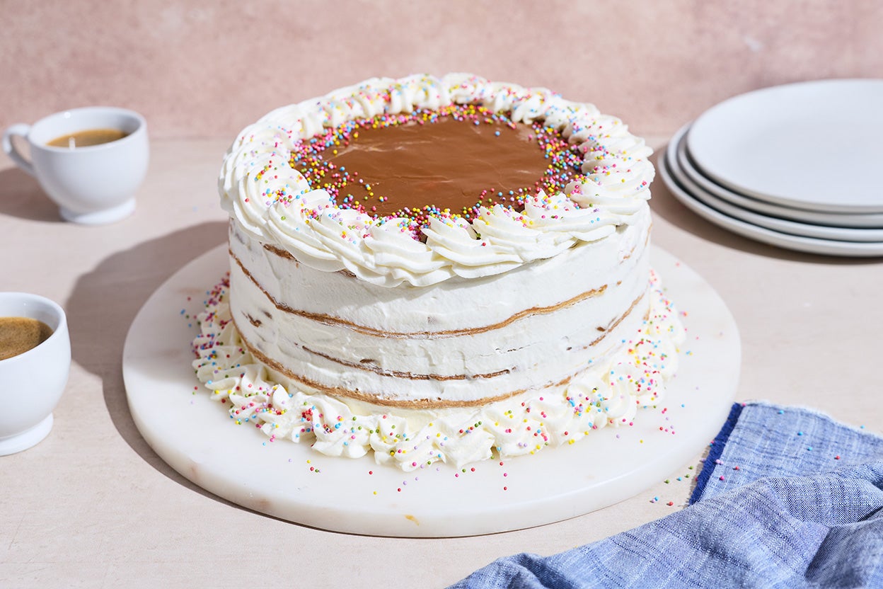 When ready to serve, let the cake sit at room temperature, uncovered, for 1 hour before decorating with nonpareils or sprinkles. Slice with a serrated knife, wiping it clean between slices.