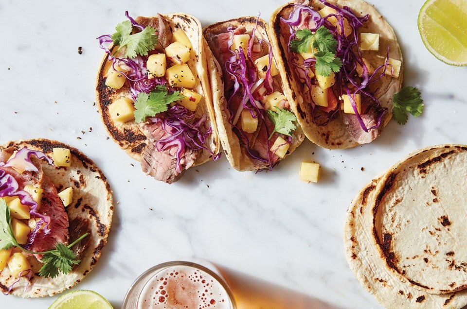 To cook tortillas: Peel the top piece of plastic and then the bottom piece away from the tortilla. Quickly but gently lay the tortilla on the hot pan. Don’t worry if it isn’t perfectly flat (you’ll get better as you practice), and don’t try to move it, which will cause it to tear.