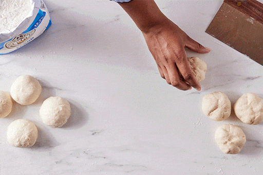 To pre-shape the dough: Working with one piece of dough at a time, fold the edges into the center. Pinch to seal and set aside. Repeat with the remaining pieces of dough.